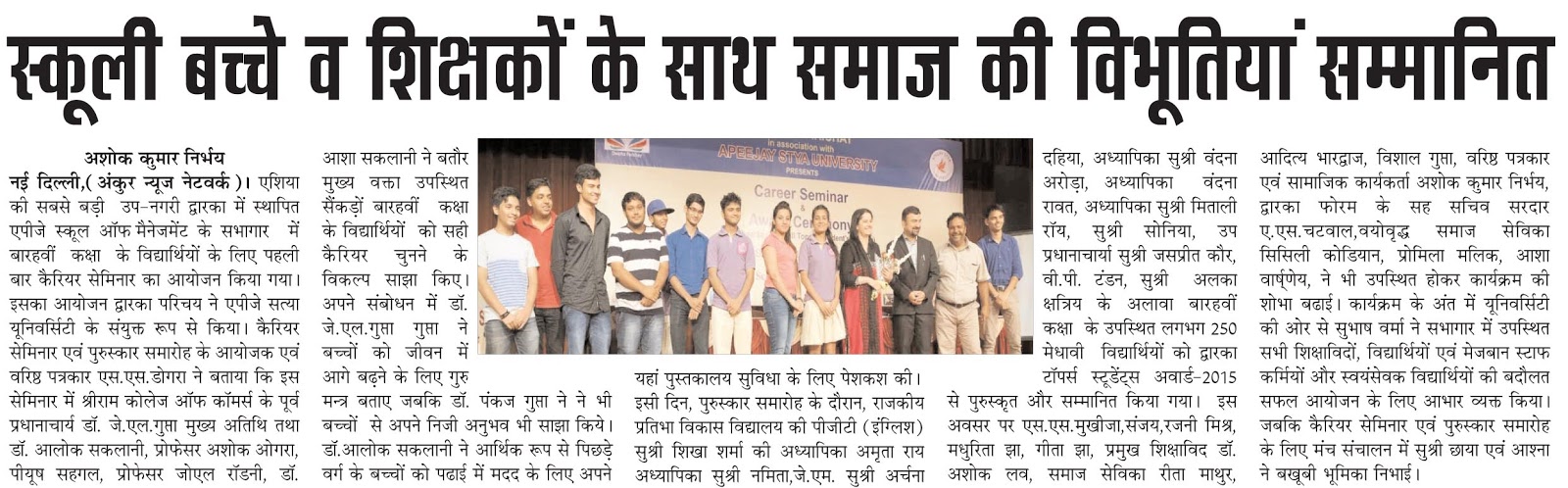3rd Dwarka Toppers Award 2015 – Media coverage by National Hindi newspaper