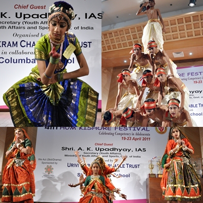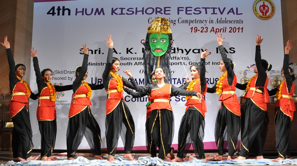 Hum Kishore festival (4th in the Series), an annual event organized by Urivi Vikram Charitable Trust to celebrate the competitive talent of adolescents in their co-curricular activities, was held from 19th to 23rd April, 2011 at three venues namely Urivi Vbikram National Centre for Adolescents (UVNAC), St. Columba’s School and PHD House. During these week-long celebrations, the Hun Kishore Festival engages a large number of students from as many as 63 Schools/Educational Institutions across Delhi/NCR. This year, prestigious St. Columba’s School has joined as a co-host. Starting with a series of competitions in painting, classical dance, instrumental Music, folk dance, singing, skit, elocution, debate, rangoli, create in best out of waste, essay writing, and standby comedy, the festival culminated into grand Finale showcasing the performances by the finalist. One of the contests ‘we act (skit/drama)’ was sponsored by National Foundation for Communal Harmony (NFCH). The teams offered for the various competitions are adolescents – centric and of current value, such as ‘protection of environment’ for Rangoli!;`Discipline and Success are interlinked’ for Elocution; `Parental Control over adolescents is a Boon or Curse’ and `Grand Parents are a Problem or a Solution to the Adolescents’ for Debate and the like.