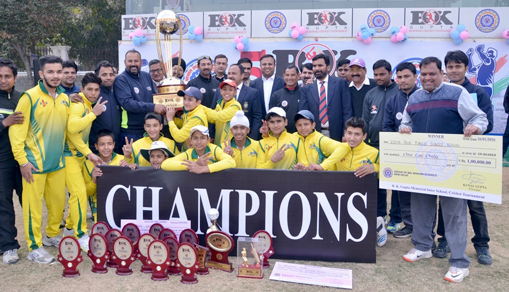 Vidyya Jain Public School, Rohini (Delhi), emerged champions of 5th B. K. Gupta Memorial Cricket Tournament conducted byBal Bhavan Group of Schools, which concluded at Bal Bhavan International School ground, Dwarka on Saturday. They defeated host team at home ground in the finals.In a high scoring game opting to bat first, Vidya Jain made a healthy 181 for four in the 20 overs.. The Vidya Jain’s CaptainMayankGosai over haul through his century and won the hearts of spectators. With six batsmen unbeaten, team was declared victorious by 8 wkt.