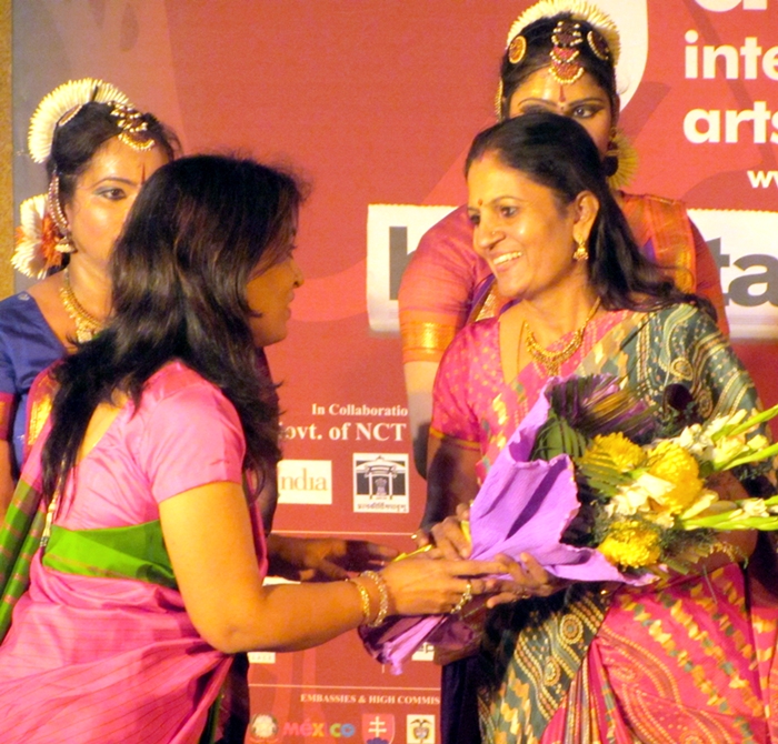 The dancers were felicitated on the occasion by DIAF. Mrs. Mythili Attavar, General Secretary S.U.N.A.INA was honoured on stage and received a bouquet and memento from the organizers on behalf of Guru Smt. Kanaka Sudhakar.