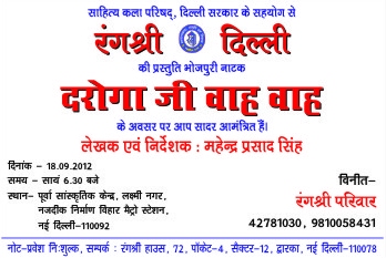 RANGASHREE a Bhojpuri Repertory Theatre Group, supported by Ministry of Culture, Govt of India and Sahitya Kala Parishad, Govt of Delhi, is going to Stage a Comedy Play “DAROGA JEE VAH VAH” written & directed by Mahendra Prasad Singh On 18th Sept.2012 at 6.30pm in PSK (Poorva Sanskritik Kendra), Lakshmi Nagar, Near Nirman Vihar Metro Station.