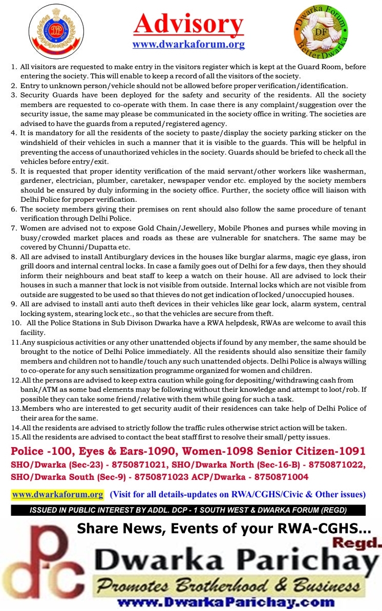 | Issue of Advisory on Security guideline for RWA-CGHS in Dwarka by Delhi Police and Dwarka Forum |