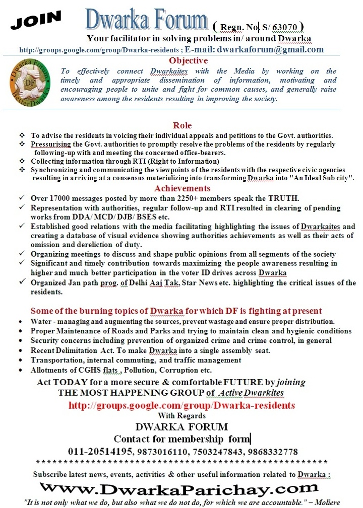 Share and highlight problem/ issues in your RWA-CGHS – Dwarka sub-city at Dwarka Forum ( More than 2500 active members)