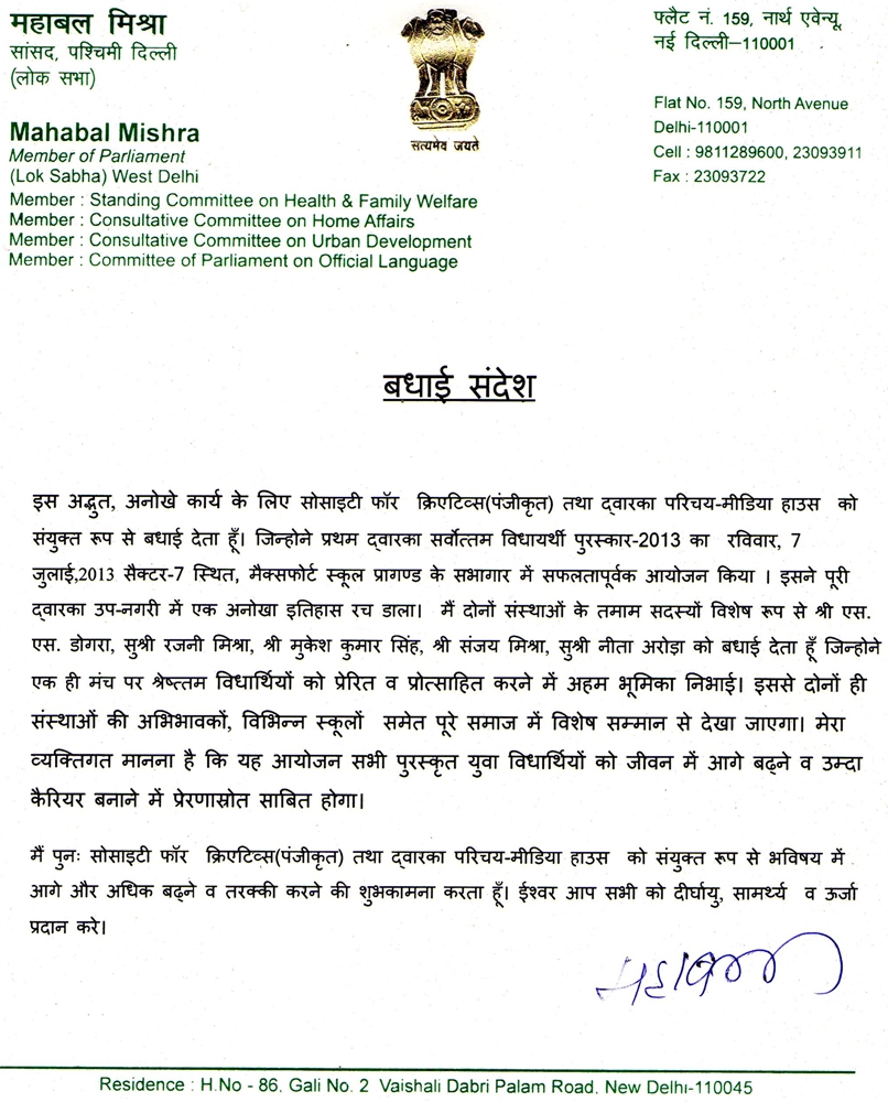 बधाई सन्देश – श्री महाबल मिश्र -संसद , पश्चिमी दिल्ली