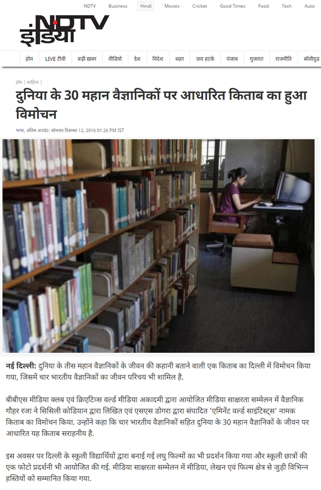 Book on 30 Eminent World Scientists coverage in NDTV India