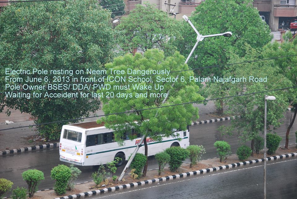 BSES waiting for an accident? – Electric pole resting on Neem Tree Dangerously since 20 days…