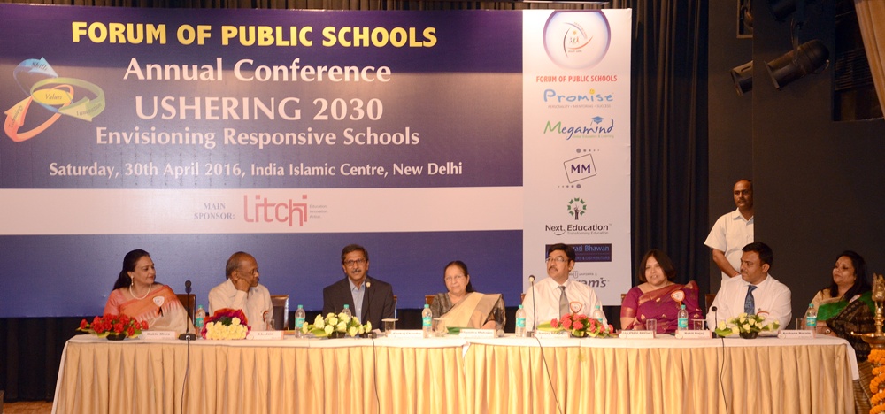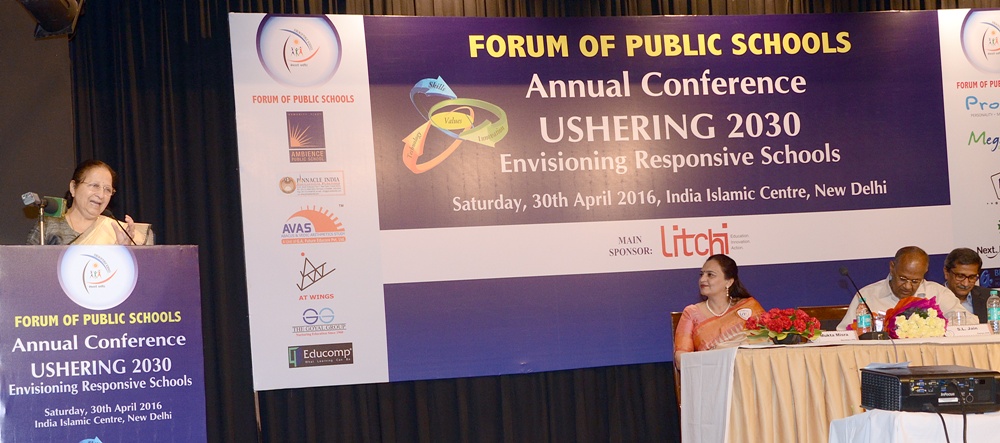 An Annual Conference with the theme : Ushering 2030 : Envisioning Responsive Schools was organized by Forum Of Public Schools on 30th April 2016 at the India Islamic Centre, New Delhi with Smt. Sumitra Mahajan Hon’ble Speaker Lok Sabha as the Chief Guest of the confluence. Philosophy and doctrines of enlightenment with educationalists as torch bearers of progress has been the vision of Forum Of Public Schools since its establishment in 1985. Empowerment of education among school going children with creative and skill based learning is the main aim of all academic policies and programmes. School Principals and teaching faculty need to take proactive steps to prepare the students for facing the global challenges.