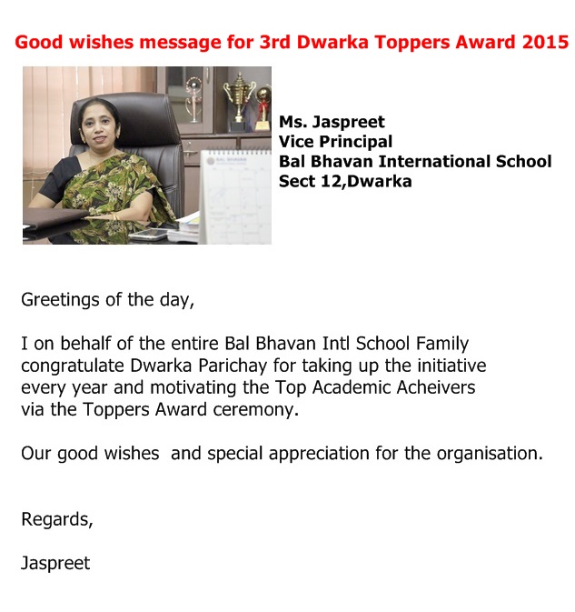 Good wishes message for 3rd Dwarka Toppers Award 2015