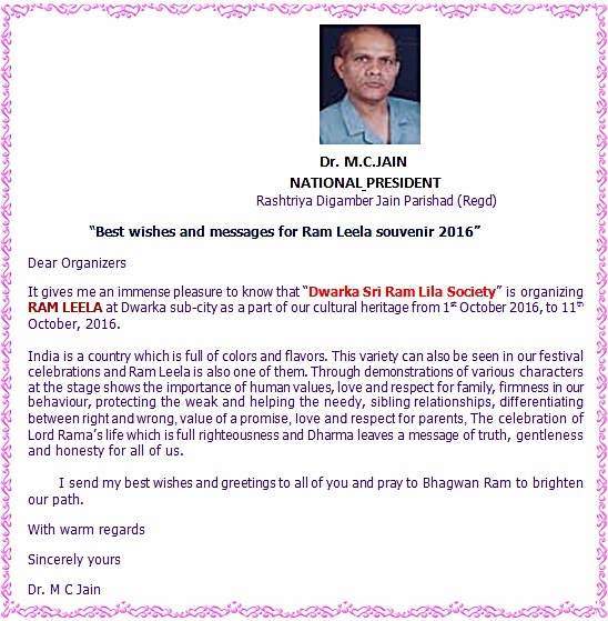 Good wishes message for Dwarka Ramlila 2016 from Dr. M.C. Jain