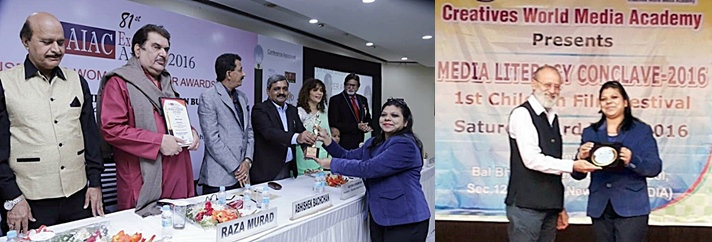 I have recently been awarded with “Inspiring Woman Achievers Award- Film making “by All India Achievers Committee (AIAC) and “Media Excellence Award” by BBIS Media Club & Creatives World Association, New Delhi, Year 2016.