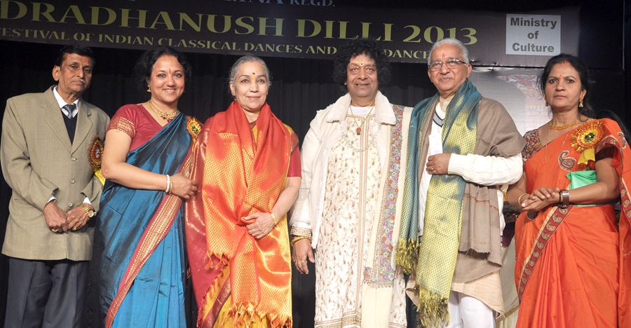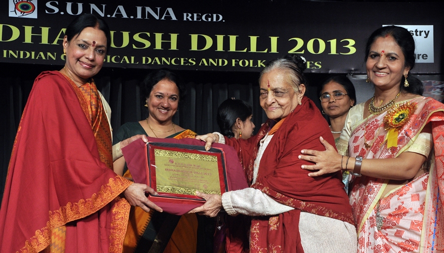 Indradhanush Dilli 2013, a festival of Indian Classical and Folk Dances, kick started with a vibrant Kathak performance by Natalia Dits from Russia on the second day of the National event. Hosted by SUNAINA Regd. in association with ICCR and Ministry of Culture, the evening included scintillating performances of the Indian Classical Dances. Highly acclaimed Bharatanaytam artists, Naatyacharya Dr. V P Dhananjayan and Naatyacharya Shanta Dhananjayans (Padmabhushan Awardees) were honoured with the Guru Samman Award. A very verstaile and old artiste Tara Bala Gopal was honored with the Paras Mani Award. Kuchipudi performance by Pranamya Suri was a visual treat to the audience. She performeed “Swagatam Krishna” . Lavanya Devi and group, disciples of Guru Prof. Dr. Deepti Omchery Bhalla, presented a divine Mohiniattam performance. Divya Shivasundar, Bharatanatyam artiste from Chennai, presented beautifully ‘Chaliye Kunjan me’ , a Swati Thirunal’s composition.