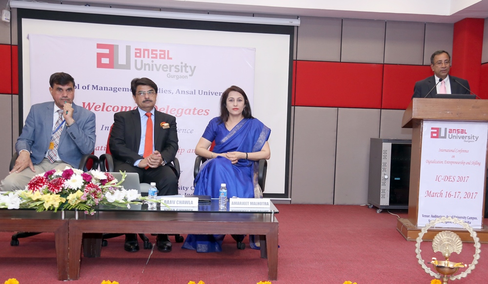 A two-day International Conference on Digitalization,Entrepreneurship and Skilling was organized successfully at School of Management Studies, Ansal University Gurgaon on 16-17 March, 2017. The Chief Guest of the Conference was Dr. M. P. Poonia, Vice-Chairman, AICTE who motivated the audience to leverage their team skills to achieve success in contemporary times. Guest of Honour, Mr. Rajiv Chawla, Chairman- IamSMEofIndia; President – Faridabad Small Industries Association spoke about the existing skill gaps, the entrepreneurial mindset and technological disruption. In his Presidential Address, Prof. Kamlesh Misra, Vice-Chancellor, Ansal University spoke on the need to gear up for the opportunities that the present government has opened up for the youth today and become job creators instead of job seekers.