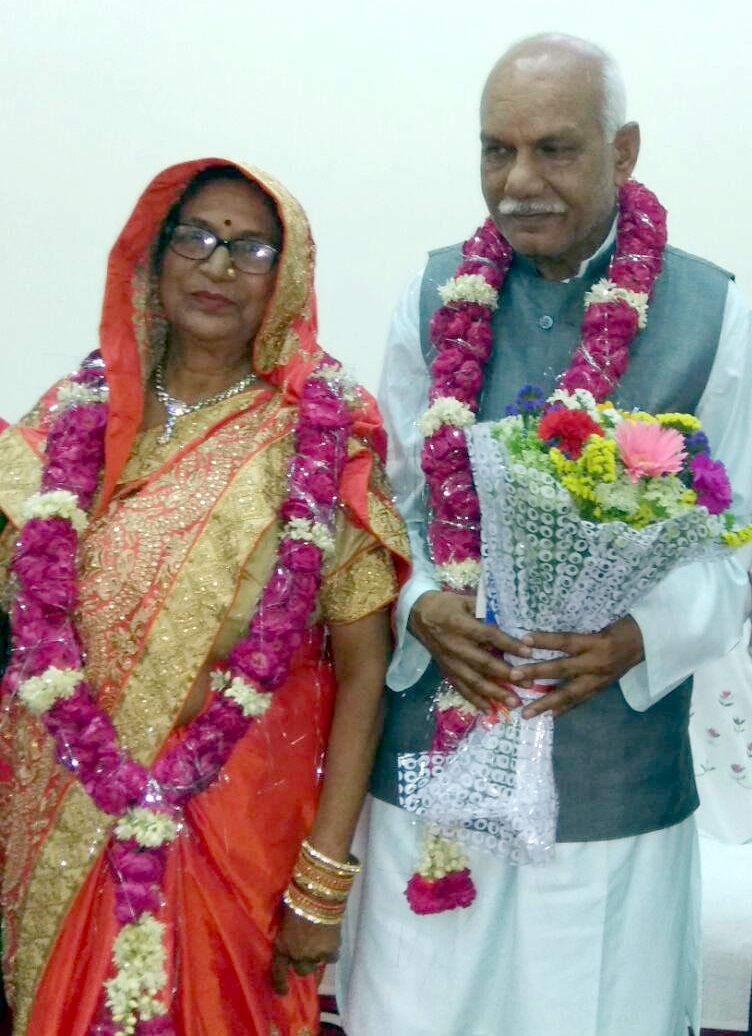During the Satsang held on the 2nd May, 2017, Nirankari Satsang Bhawan, Dwarka, Sector 19-B, celebrated marriage anniversaries of Smt. Geeta ji and Shri Ram Kumar ji and Smt. Neerja Bhatia ji and Shri Ashok Bhatia ji, with full social / religious gaiety and fervour. Not only that, birthdays of two small kids, namely – Master Nihar Khurana (s/o. Smt. Manisha Khurana and Shri Mandeep Khurana) and Master Prateek Dobbal (s/o. Smt. Hema Bai and Shri Kishore Kumar) were also cerebrated during the Satsang. For the first couple, Shri Ram Kumar ji & Geeta ji , it was their Golden Jubilee anniversary and the Bhatia couple celebrated their 20th anniversary. As a part of the custom for this kind of celebration, first Mrs. Geeta ji, the bride garlanded her husband and then the husband Ram Kumar ji also garlanded her as mark of respect and regards for each other. Then two chairs were placed in front the Saint who was seated on the stage for imparting religious discourse and a common garland is put around the couple’s necks as a symbol of their oneness in marriage. Then religious rituals and hymns were sung by the singer sitting nearby and other saints gathered there showered petals of flowers on the couple. Speaking on the occasion, Shri Ram Kumar said that he was not at all informed by his family that they are going to celebrate their golden jubilee anniversary like this at the Satsang Bhawan in such a big manner. They were only told that their entire family is going to attend our routine Satsang. It is really a big surprise for us both, as our sons, daughters-in-law, grand children, all made the entire arrangements with the help of other saints who are responsible for making arrangement for our Satsangs. Generally, it is the parents who do so many goody 2 things for the welfare and well-being of their children and also to make them happy and enjoy life; but today, all things were arranged by their children, without the knowledge of the couple celebrating their Golden Jubilee Anniversary.