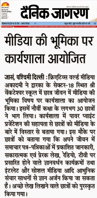 Media coverage in Dainik Jagran about workshop on role of media in student’s life
