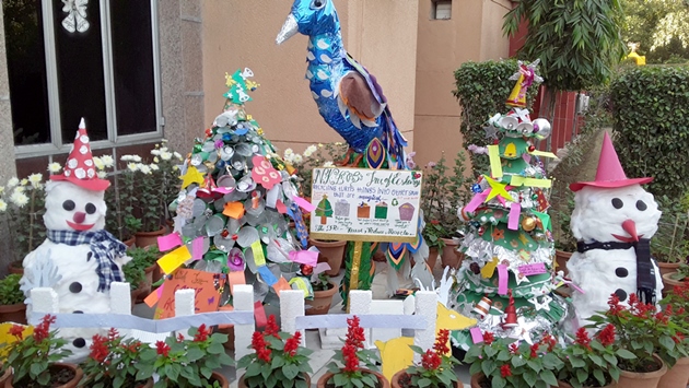 Keeping this in mind, students of Primary wing were given a platform to exhibit their creative talent on Christmas Eve ‘as it is a season of giving and sharing’— by making Christmas tree using waste paper, aluminium foil, pencil shaving. The children participated earnestly in the fun-filled activity and came up with amazing ideas. The objective of the activity was to create love for environment by making best out of waste with the help of recyclable things. The students used a variety of resources like old newspapers, wrinkled old wrapping papers and old cartons to create something new, creative and decorative. Little Bagrodians and their imaginative minds came together in a creative burst of energy to create the ‘Tree of Ecstasy’ on the occasion of Christmas Eve. The glistening Christmas trees along with snowman looked spectacular and awe-inspiring.