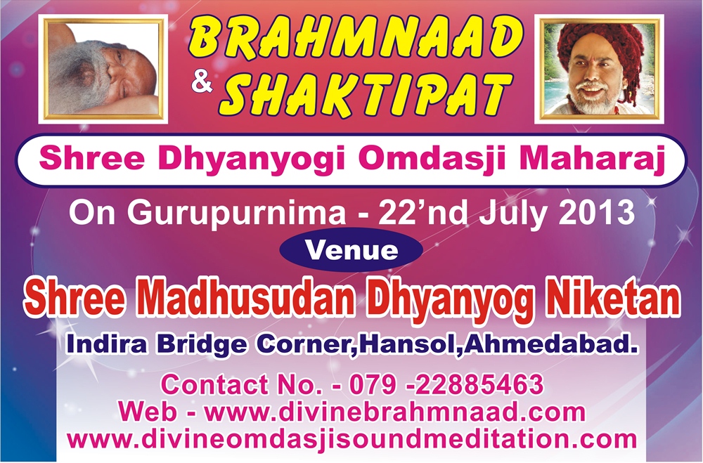 On the occasion of Guru Purnima Spiritual discourse will be held at Shri Madhusudan Dhyanyog Niketan, Hansol, Near Indira Bridge. Shri Dhyanyogi Omdas Ji-The Chairman of Niketan, will preach the teaching of Brahmnad & Shatipat. Thousands of devotees from all parts of the country will attend the said spiritual event.