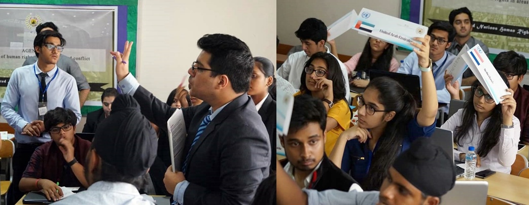 The event is co sponsored by Univquest. The MUN saw experts from various fields share their views in the six committees. They are Mr Arindam Mukherjee in AIPPM, Mr Javed Habib in FAI, Mr Pulkeet Mehra, Director Rasta Foundation in HRC, Mr Deepak Sharma with FM Radio in EPOC, Mr Chander Kant Pandit in IPL and Dr Janice Darbari and her father Dr Shatrughan Darbari in HRC. Dr Shatrughan Darbari participated in the United Nations in 1950s along with Dr Krishna Menon. He reminisced those days and was appreciative of this venture of school. Dr Janice Darbari, reminded the participants of what is written on the wall on the office of United Nations , that implies that nations shall not wage war.