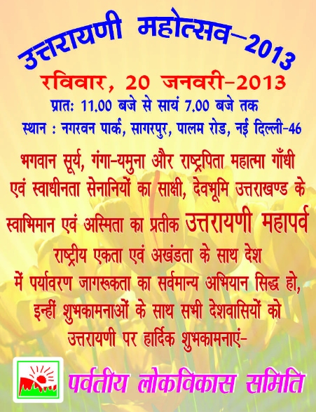 Parvatiya Lokvikas Samiti have been celebrating Uttarayani Mahotsav for the last 8 years. Uttarayani is the auspicious festival that is celebrated almost entire country in different name and style. On the day of Uttarayani the sun enters the zodiacal sign of maker that is the reason it is the festival of sun which is the creator of life on earth. On this occasion we also pay homage to our Himalaya and Rivers including holy Ganga.