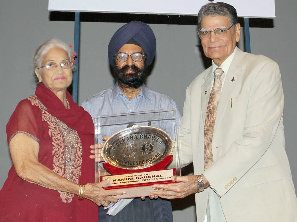 Veteran Film Actress Kamini Kaushal, aged 86 years, was conferred Kalpana Chawla Excellence Award by Kalpana Chawla’s father Sh BL Chawla at a Function held at Epicentre, Gurgaon on Sept 25 by Punjab Engineering College Chandigarh Old Boys Association (PECOBA) in memory of its alumnus late astronaut Kalpana Chawla .